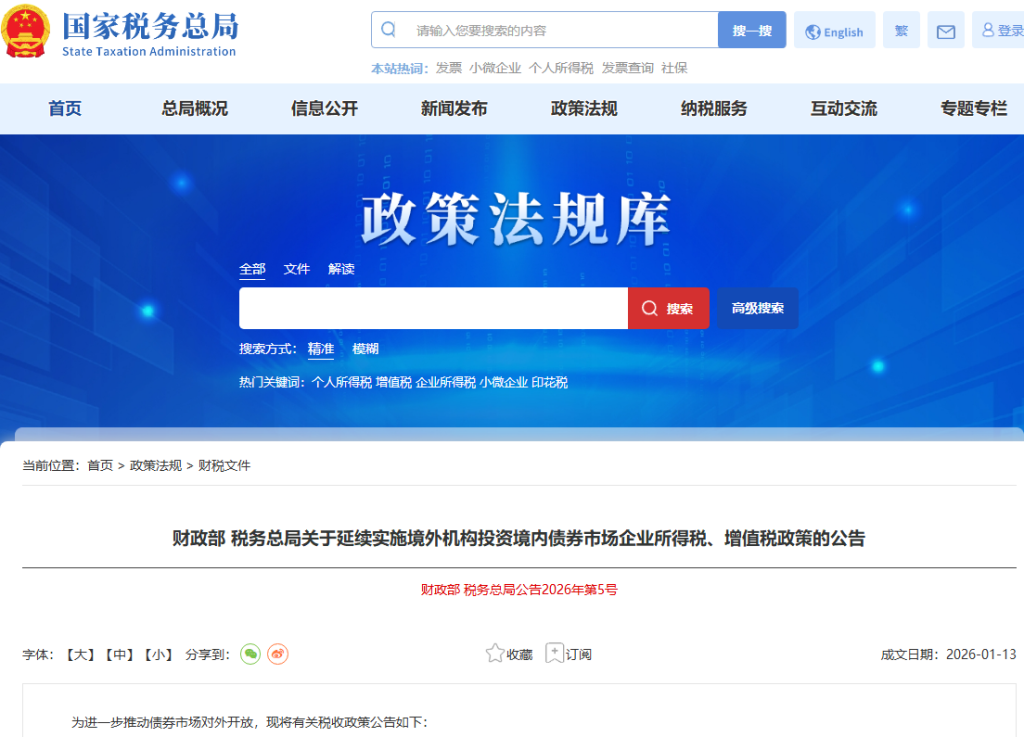 在债券市场对外开放持续深化的背景下,财税政策的定向支持成为稳定市场预期的重要支撑。财政部、国家税务总局联合发布公告,明确了2026年-2027年债券利息收入暂免征收企业所得税和增值税的政策安排。接下来,请随小编一起来看看通知内容详情吧。